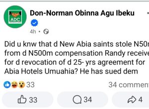 Don Norman had posted on his Facebook page that “The new Abia Saints stole N50m from d N500m compensation Randy received for d revocation of the 25- yrs agreement for Abia Hotels Umuahia”